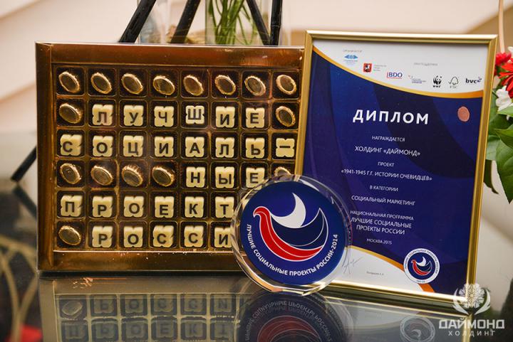 2 марта 2015 года прошло торжественное награждение Национальной Программы «Лучшие социальные проекты России 2014», победителем которой был признан проект Холдинга Даймонд «1941-1945 г.г. Истории очевидцев», награжденный почетным знаком и дипломом. Церемонию награждения провела известная телеведущая Эвелина Бледанс, которая сама принимает активное участие во многих благотворительных акциях.