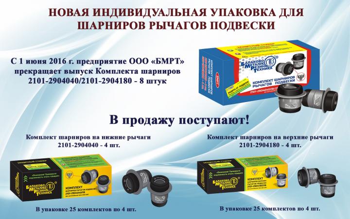 С 1 июня 2016 г. в продажу поступили два отдельных комплекта шарниров в обновленной упаковке, это: комплект шарниров рычага подвески 2101-2904040 — 4 шт. и комплект шарниров на верхние рычаги 2101-2904180 — 4 шт.