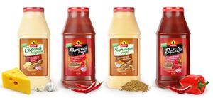 С учетом значительного прироста рынка и предпочтений российских потребителей был сформирован базовый ассортиментный портфель из восьми товарных позиций: соусов «Цезарь», «Сырный», «Чесночный», «Горчичный», «Барбекю», «Острый», «Томатный» и «Сальса». Новинки решено выпускать в самой удобной и востребованной прозрачной упаковке объемом 1,7 литра с ручкой и защитной мембраной от первого вскрытия.