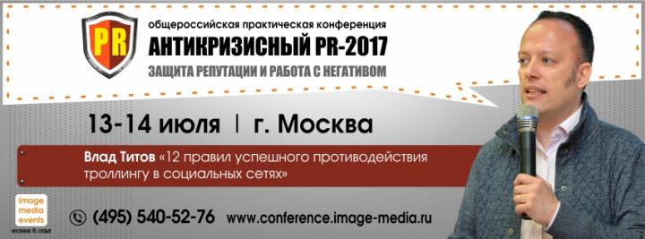 С таким докладом выступит руководитель Лаборатории Коммьюнити Влад Титов на общероссийской специализированной тематической конференции «АНТИКРИЗИСНЫЙ PR-2017: защита репутации и работа с негативом», которая состоится в Москве 13-14 июля.