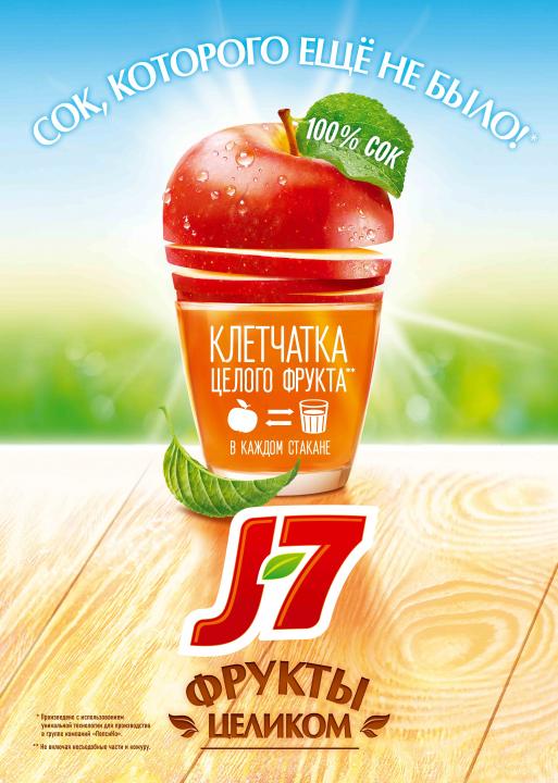 Популярный бренд J7® представил абсолютно новый на соковом рынке продукт, при производстве которого используется революционная технология обработки фруктов, благодаря которой сохраняется натуральная клетчатка. Инновация заключается в особом способе измельчения ягод и фруктов на частички разного размера. В одном стакане такого сока содержится 29% суточной нормы клетчатки, как и в целом яблоке. Частицы фрукта придают новому соку особую «бархатистую» текстуру и уникальный вкус. Новинка представлена тремя вкусами: «Яблоко», «Мультифрукт» и «Ягоды».