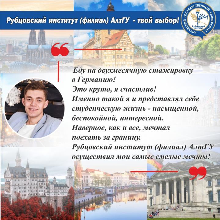 «Еду на двухмесячную стажировку в Германию! Это круто, я счастлив! Именно такой я и представлял себе студенческую жизнь - насыщенной, беспокойной, интересной. Наверное, как и все, мечтал поехать за границу. Рубцовский институт (филиал) АлтГУ осуществляет самые смелые мечты!»