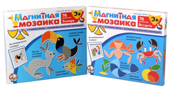 Мозаики являются одним из любимых занятий детей. Им интересно, как при складывании отдельных элементов возникают фигуры. Особенно привлекательны магнитные мозаики. Они, в отличии от традиционных пластиковых, не ограничены количеством отверстий на плате, формой элементов и дают больше простора для фантазии и самовыражения малышей. Магнитные мозаики для детей и включают в себя по 78 мягких магнитных элементов трех основных форм и расцветок. Магнитную мозаику удобно собирать на размеченном металлическом поле размером 23х19,5 сантиметров. Ребенку потребуется максимум усидчивости и внимательности, чтобы используя 3 вида элементов собрать забавные фигурки, изображенные на коробке. Мозаика предоставляет большой простор для детской фантазии в создании своих собственных персонажей. Игры безопасны для малышей в возрасте от 3 лет, в них отсутствуют мелкие элементы, а металлическое поле заключено в рамку из картона, но, тем не менее, контроль со стороны взрослых не будет лишним. Магнитные мозаики для детей «Зоопарк» и «Ассорти» всегда можно купить в интернет магазине производителя «Десятое королевство» по доступной цене с доставкой по России.