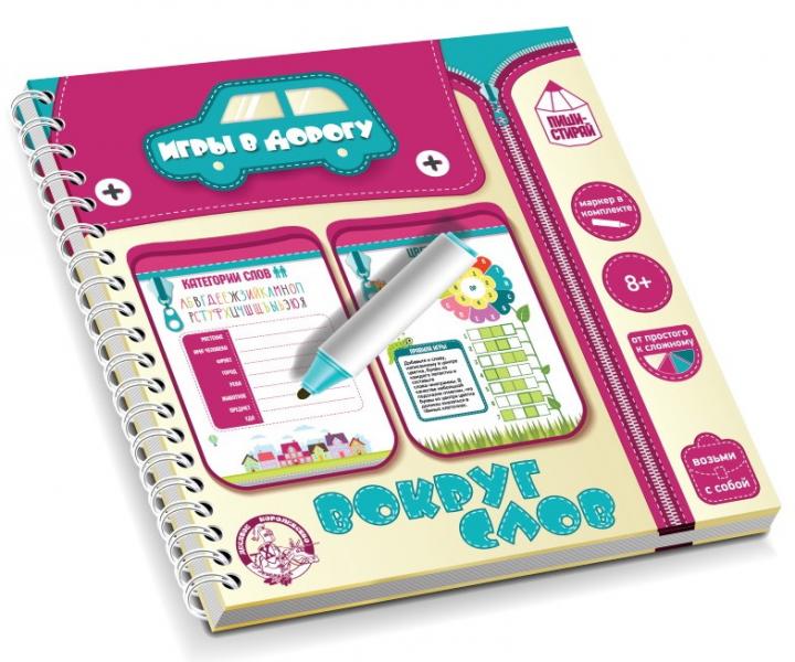 «ВОКРУГ СЛОВ» В этой книжке — 10 двухсторонних карточек с классическими головоломками и играми-стратегиями для двоих. Играйте в «Балду», «Виселицу», «Диагональ», «Типографию» или выполняйте необычные задания про буквы и слова. Игры в дорогу. «Вокруг слов» Игра имеет 4 уровня сложности и способствует развитию речи, расширению словарного запаса, тренирует внимание и логическое мышление.