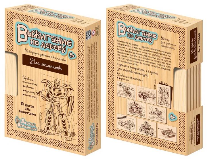 В наборы «Для мальчиков» (5 и 10 шт.) также входят пустые доски – на них юный умелец сможет потренироваться в работе с выжигателем, создать уникальную картинку или повторить любую из , размещенных на нашем сайте.