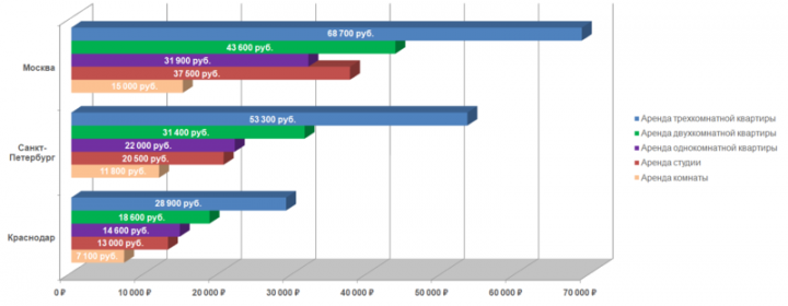Сайт Onrealt.ru проанализировал и сравнил стоимость аренды квартир разных типов в Краснодаре, Санкт-Петербурге и Москве.