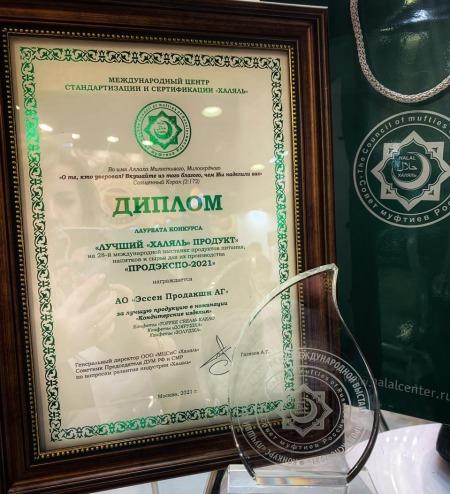 Диплом лауреата конкурса «Лучший «Халяль» продукт» в номинации «Кондитерские изделия», «Эссен Продакшн АГ» получила сразу за три новинки кондитерской фабрики «Эссен». Наградой были отмечены конфеты «Toffee Сream какао», «Доярушка», «Золушка». Конкурс состоялся в рамках 28 международной выставки продуктов питания напитков и сырья для их производства «Продэекспо-2021».