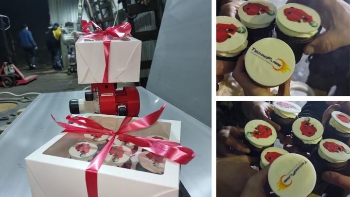 Открытие Цеха №2 совпало с днем рождения шефа ООО "Технофлэйм". Получился двойной праздник, который коллектив компании отметил съедобными и вкусными горелками "мини".