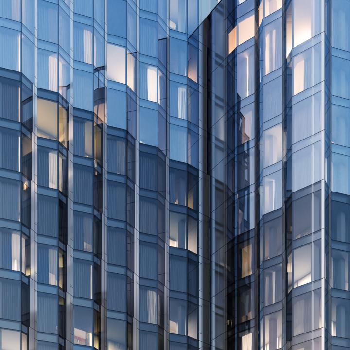 Модульный фасад «Берегового» - это разработанный специально для проекта вид панорамного остекления, которое состоит из светопрозрачных модулей шириной 1,5 м и высотой 3,5 м. Модули стыкуются при помощи алюминиевого профиля толщиной не более 10 см и не имеют дополнительных перекладин и фрамуг, что не создает помех для обзора и открывает уникальные виды на набережную Москвы-реки, парки и деловой центр столицы.