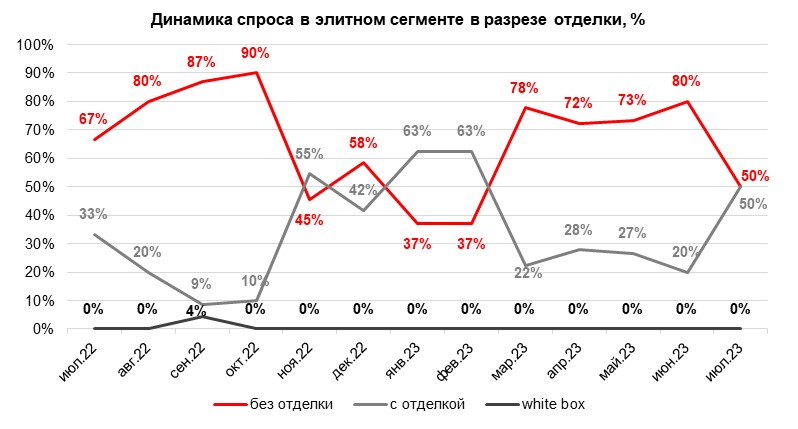 «Если смотреть на усредненные показатели за последние четыре года, то картина видится однозначной: в структуре спроса элитной недвижимости квартиры без отделки лидируют, находясь на уровне 55-67%, тогда как доля квартир с отделкой колеблется в районе 35%», – отмечает Роман Родионцев, директор департамента проектного консалтинга Est-a-Tet.