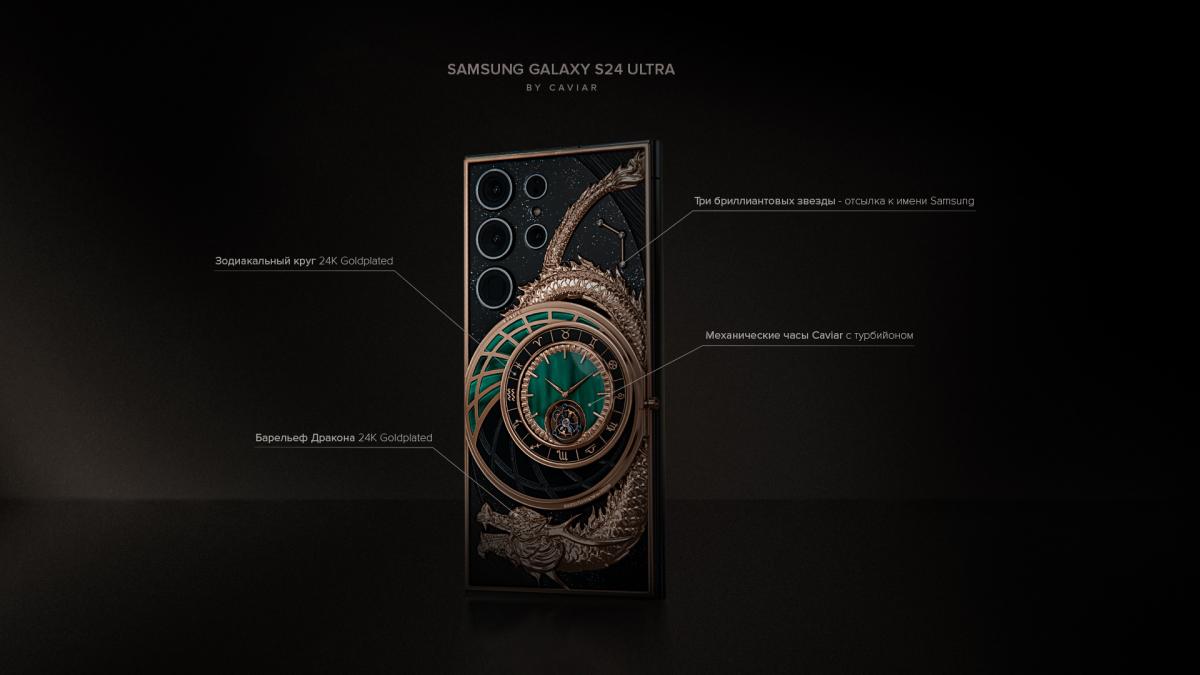 Флагманом коллекции Era of Dragon является Samsung S24 Ultra Yong, стоимостью 980 000 рублей. Модель украшают три звезды – отсылка к первому логотипу Samsung, часы с одноминутным турбийоном и с зеленым циферблатом и барельеф восточного дракона, покрытый 24-каратным золотом. Дракон должен стать предвестником удачи для всех поклонников Samsung в новом году, который по восточному календарю является годом зеленого дракона.