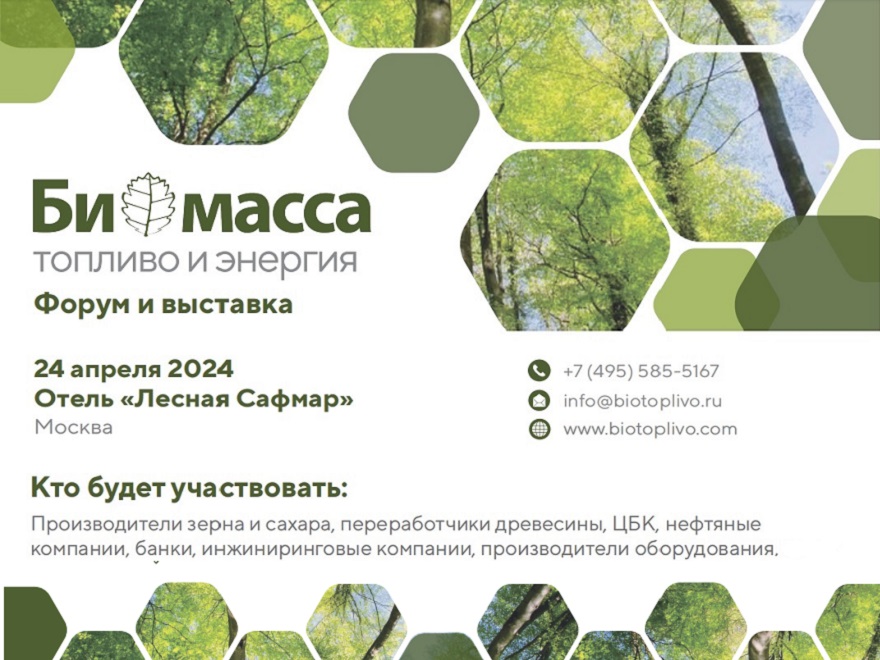 24 апреля 2024 года в Москве, в отеле «Лесная Сафмар» состоится Форум и выставка «Биомасса: топливо и энергия» – специализированное отраслевое мероприятие, посвященное производству и применению автомобильных и котельных биотоплив из возобновляемого сырья: этанола, бутанола, бионефти, пеллет и брикетов. Главная цель Форума – обсудить производство и использование жидких и твердых (моторных и котельных) биотоплив. Организатор – Российская Биотопливная Ассоциация (РБА). Участниками Форума станут производители и трейдеры зерна, сахарные компании, лесозаготовители и переработчики древесины, ЦБК, нефтеперерабатывающие компании, ЖКХ, сети АЗС, предприниматели, банки, венчурные компании, инвестиционные фонды, инжиниринговые компании, производители оборудования, представители региональной и федеральной власти, журналисты, экологи, ученые – все, кому интересны топлива из возобновляемого сырья. Президент РФ Владимир Путин подписал в конце 2018 года принятые Госдумой поправки в ФЗ «О государственном регулировании производства и оборота этилового спирта, алкогольной и спиртосодержащей продукции...». Изменения регламентируют производство и применение топливного биоэтанола, открывая тем самым новые возможности для бизнеса. По словам Президента Российской Биотопливной Ассоциации Алексея Аблаева: «Как подписанный на самом высоком уровне закон, так и Программа развития биотехнологий в России, сделают развитие рынков биотехнологий и биотоплива локомотивом, способным придать стране импульс для дальнейшего роста, базирующегося на диверсификации экономики. Форум и выставка «Биомасса: топливо и энергия» – это место встречи, где участники отрасли обсудят пути развития бизнеса на биотопливном рынке с учетом благоприятной политической конъюнктуры». В рамках мероприятия пройдет выставка, а ведущие специалисты обменяются опытом и выступят на различные темы, включая: Состояние отрасли: развитие технологий и рынка биотоплив. Европейский налог на СО2 и возможности уменьшения его влияния на производителей нефтехимии, удобрений и других продуктов. Биозаводы: инжиниринг, производимые продукты, экономика. Производство пищевого и технического спирта: тонкости технологии, реконструкция заводов, новые виды сырья. Перепрофилирование спиртовых заводов на производство кормовых дрожжей и других биопродуктов. Топливный биоэтанол, бутанол и другие транспортные биотоплива. Биотоплива из соломы и опилок: технологии и коммерциализация. Пиролиз и газификация: бионефть, сингаз и древесный уголь. Биодизель, биокеросин и растительные масла как топливо. Твердые биотоплива: пеллеты, брикеты, щепа. Логистика лесной и сельскохозяйственной биомассы. Энергетика и водоподготовка при реализации проектов. Другие вопросы биотопливной отрасли. Приглашаем Вас принять участие в работе форума и выставки «Биомасса: топливо и энергия - 2024»! По вопросам аккредитации и за дополнительной информацией, пожалуйста, обращайтесь: info@biotoplivo.ru или по телефону +7 (495) 585-5167, а также на наш сайт www.biotoplivo.com Об Ассоциации: Российская Биотопливная Ассоциация (РБА) объединяет участников отрасли возобновляемых транспортных топлив, и развивает использование возобновляемых топлив и глубокую переработку зерна в России. Главная цель РБА – обеспечить наилучшие законодательные, комм