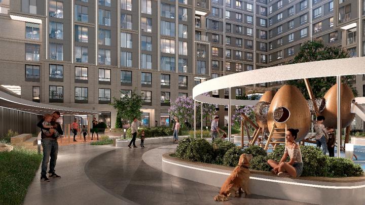 В комплексе, состоящем из одного корпуса, предусмотрены два закрытых двора-сада. В благоустройстве запланированы патио, площадки для игр, беседки и искусственный водопад. Украшать территорию будут фонтан, арт-объекты, веранды. В лобби появится такси-поинт, ресепшн, лаундж-зона, а на крышах разноэтажного корпуса оборудуют зимний сад и чайную. Инфраструктура предусматривает два павильоны с летним кинотеатром, кафетерий и детский клуб.