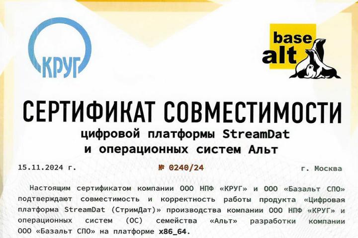 Получен сертификат совместимости платформы цифровизации StreamDat и российских операционных систем семейства «Альт» от компании «Базальт СПО» (г. Москва). Сертификат подтверждает успешное проведение тестовых испытаний совместной работы платформы и ОС.