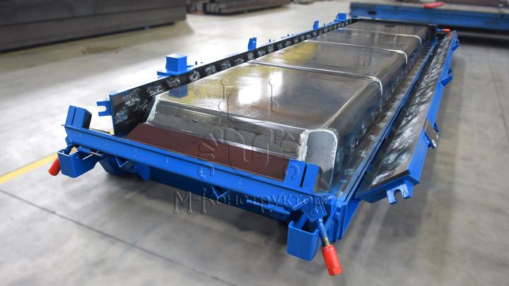Остальное привычно: поддон, на котором крепятся формующая поверхность и подвижные борта, где на продольных (по два с каждой стороны) расположены съемные элементы, необходимые при штабелировании, т.е. установке металлоформ одна на другую. Также на продольных бортах расположены стяжки, придающие форме жесткость при заливе бетонной смеси.