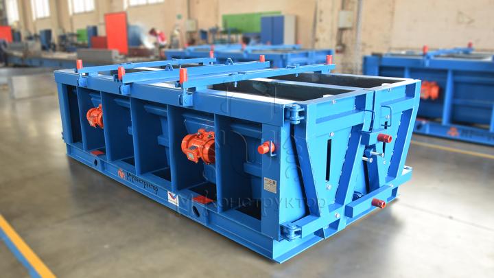 После уплотнения и созревания бетонной смеси снимаются кондукторы и балки, расположенные сверху на продольных бортах: первые — фиксируют сменные пустотообразователи дренажа, вторые — предусмотрены под установку рым-болтов. Потом раскрываются двери с отверстиями под специальные замки. Во избежание протечек бетонного молочка и сколов изделия при распалубке на дверях резиновые уплотнители. Финальная операция — извлечение блоков из формы, которая рассчитана на производство сразу двух ЖБИ.