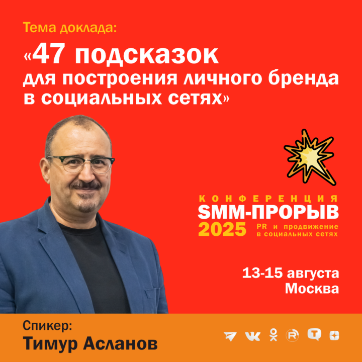 С таким докладом выступит Тимур Асланов на ежегодной трехдневной конференции о продвижении в социальных сетях, о digital PR и маркетинге «SMM-ПРОРЫВ-2025», которая состоится в Москве 13-15 августа 2025 года.