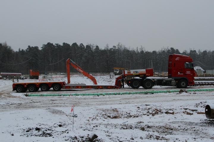 Перевозка спецтехники тралом-компания Техоптимум. Тягач DAF 105 и низкорамный полуприцеп Faymonville компании Техоптимум.