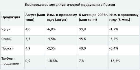 Согласно предварительным данным Корпорации «Чермет», в августе текущего года российские металлурги зафиксировали снижение объемов производства по всем основным категориям продукции. Это стало первым случаем одновременного падения выпуска чугуна, стали и проката за летний период.