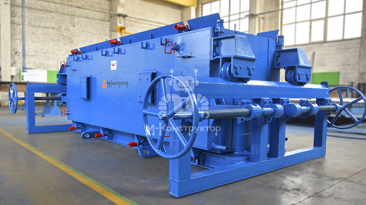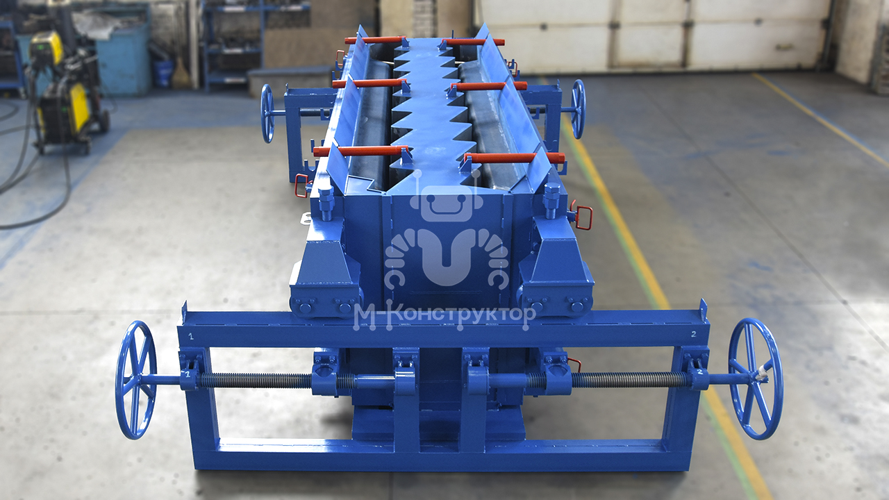 Состоит из центрального формирующего модуля (двусторонняя ступенчатая поверхность) и двух подвижных продольных формообразующих бортов. Все элементы смонтированы на жёсткую силовую раму, включая механический механизм распалубки. При распалубке важно соблюдать синхронность вращения колес во избежание перекоса.