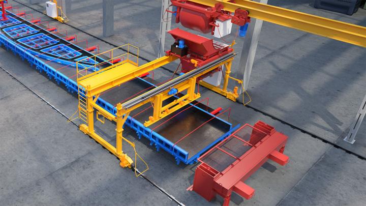 Размотчик термополотна, заглаживающий вертолет, адресная подача — всё это оборудование входит в состав производственного комплекса, сердцем которого является формующая линия для выпуска преднапряженных изделий. Функцию основной артерии, выполняет портальный бетоноукладчик.