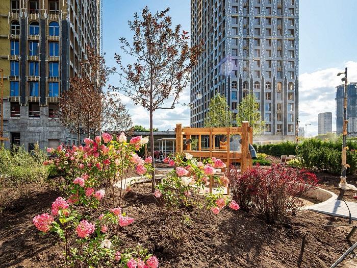 В настоящий момент во дворе обустраивают пешеходные дорожки — укладывают брусчатку и бордюры. Возле 1 и 2 корпусов рабочие подготавливают грунт под газон и цветники, а также приступили к высадке кустарников и деревьев-крупномеров — всего на территории планируется высадить порядка 3000 растений. Среди них остролистные клены, рябины, ивы, сосны, можжевельник, барбарис, гортензии, спиреи, и сирень.