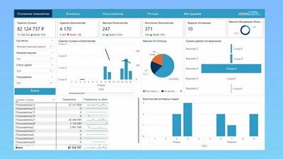 На первой странице собраны ключевые KPI: сумма и количество сделок, количество звонков и контактов. Визуализации показывают тренды по периодам, структуру звонков по статусам и сумму сделок по воронкам. Внизу расположен рейтинг менеджеров, а также график активности задач. Кнопка «Вывод» формирует готовую текстовую сводку на основе данных и дает рекомендации к действиям.