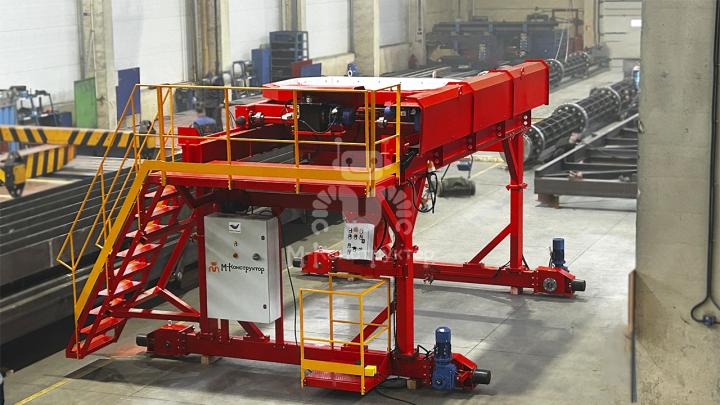 В основе любой портальной машины — самодвижущаяся силовая рама, установленная на рельсовые пути, традиционно расположенные на полу цеха. Однако в текущем проекте бетоноукладчик будет работать на высоте более 3 м, осуществляя подачу бетонной смеси в отсеки кассетной установки типа СМЖ. Такая оторванность от земли требует повышенных мер безопасности, поэтому здесь добавлен пост управления.