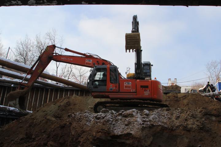 Компания Техоптимум-разработка котлована и вывоз грунта. ЭкскаваторыVOLVO 380 и Hitachi Zaxis 225 компании Техоптимум.