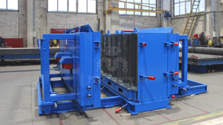 Гибкая настройка под два типоразмера и удобный съём изделийДвухместная вертикальная металлоформа для лестничных маршей спроектирована с акцентом на оперативную переналадку и удобство съёма изделий. Габариты формы — 3399,5×3954×1623,5 мм.