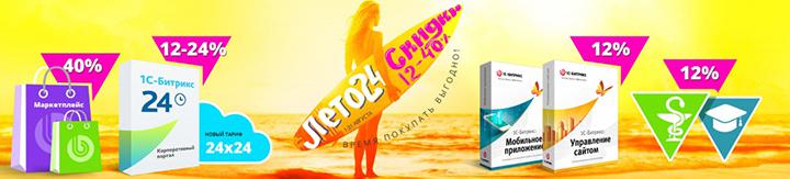 Друзья, наступил август — время крутых скидок и предложений от «1С-Битрикс»! Встречайте акцию «Лето24», которая пройдет с 1 по 31 августа 2015 года. Скидки от 12% до 40% на все продукты «1С-Битрикс», новый тариф «24х24», автопродление лицензий, помесячная оплата и многое другое!