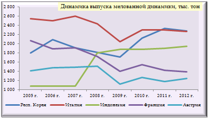 Динамика производства следующих за лидерами стран. Пик производства мелованной бумаги в Италии относится к 2007 году. После кризиса 2008–2009г.г.  выпуск немного вырос, однако докризисные объемы достигнуты не были. Республика Корея, напротив, начиная с 2009 года, резко наращивала объемы производства мелованной бумаги. В 2012 г. уровень выпуска сравнялся с показателями по объемам меловки в Италии. Начиная с 2007 года начали падать объемы производства и во Франции. Такая же тенденция коснулась Австрии. С той лишь разницей, что за 2012 год наблюдался небольшой рост производства к уровню прошлого года. Динамика выпуска меловки в Швеции за последние 10 лет была подвержена колебаниям, тем не менее, последние три года производство медленно растет. Производство меловки в Индонезии последние пять лет растет, в прошлом году прирост составил 2%.