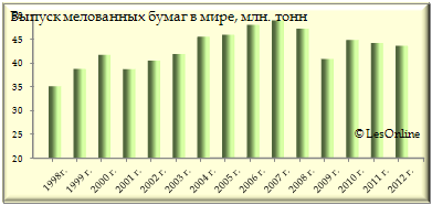 Последние три года мировой выпуск меловки медленно снижается. В соответствии со статданными всемирной организации ФАО производство мелованной бумаги в настоящее время размещается в 39 странах мира. Как видно на диаграмме максимальный выпуск меловки за последние 15 лет был достигнут в 2007 году, составив 48,87 млн. тонн. В период глобального кризиса объемы стали снижаться, причем основной спад выпуска меловки пришелся на 2009 год – рынок за этот год просел на 15% относительно максимального уровня. В 2010 году начался восстановительный период после кризиса – объемы за год выросли на 10%, однако последующие два года мировое производство меловки вновь стало медленно снижаться – на этот раз спад был на уровне полутора процентов за год. Несмотря на снижение за последние два-три года, в диапазоне десяти лет, можно говорить о небольшом росте производства. Так за последнее десятилетие выпуск мелованной бумаги в мировом масштабе вырос всего на 8% с 40,43 млн. тонн в 2002 году до 43,51 млн. тонн – в 2012 г.