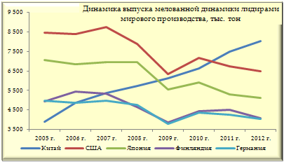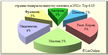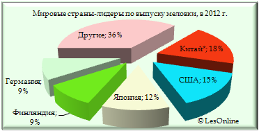 До 2011 года первое место по выпуску меловки занимали США.В 2011 году на лидирующие позиции по выпуску мелованной бумаги стремительно вырвался Китай, потеснив США. Именно в этом году Китай резко наращивает производство мелованной бумаги (рост за год на уровне 13%). Предыдущий же лидер – США, напротив, в 2011 году продолжил сокращать производство меловки, которое составило 6%. Остальные страны-лидеры, такие как Япония, Финляндия и Германия за последние семь лет также неуклонно сокращали выпуск мелованной бумаги. Резкий спад был отмечен в период кризиса 2008 – 2009 г.г. Интересно отметить, что во всех странах, представленных на диаграмме, за период глобального кризиса выпуск меловки резко просел, в то время как Китай только лишь замедлил рост. В 2010 году все вышеуказанные страны восстанавливали производство, увеличив объемы выпуска по отношению к кризисному 2009 году в среднем на 13–16%, за исключением Германии, где рост не превысил 7%. Однако докризисные объемы достигнуты не были, производство мелованной бумаги в этих странах продолжает падать. Китай же за этот период резко вырвался вперед.