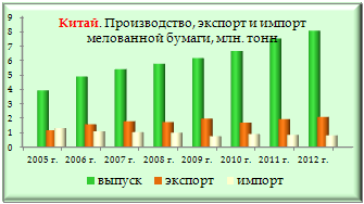 В соответствии с данными ФАО за 2012 год 18,5% всего мирового производства мелованной бумаги сосредоточено в Китае, объемы производства в 2012 г. составили 8 млн. тонн, в том числе материковый Китай 7,8 млн. тонн. Поднебесная последние семь лет стремительно наращивала выпуск этого вида бумаг для полиграфии. И, если производство меловки в странах прежде лидирующих по выпуску этой бумаги снижалось, то в Китае прирост объемов производства ежегодно составлял в среднем 10%.