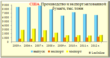 Второй по уровню производства мелованной бумаги в мире - США - также занимают вторую строчку, но только по импорту. На фоне снижения уровня производства импортные поставки меловки в США последние годы падают - так если в 2005 г. Америка закупила 2,9 млн. тонн меловки, то в 2012 г. – всего 1,7 млн. тонн. В тоже время по итогам прошлого года был отмечен рост импорта на уровне 7%.