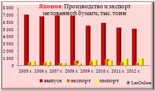 Мелованная бумага для Японии также является предметом импорта. Начиная с 2009 года, японские предприниматели активно наращивали объемы ввоза меловки в страну. И уже по итогам 2012 года Япония замыкает пятерку стран-лидеров по закупке меловки извне, заняв пятое место в мире среди импортеров с долей импорта около 5%. В прошлом году Япония закупила почти миллион тонн меловки, на 5% увеличив поставки предыдущего года.