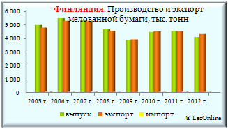 Финляндия. Динамика производства мелованной бумаги в Финляндской республике достаточно равномерна. Пик производства меловки в Финляндии отмечен в 2006 году с объемом 5,5 млн. тонн. Финских промышленников также затронул мировой кризис, который нашел отражение и в снижении выпуска меловки. Так за период 2008–2009 г.г. производство упало 30%. Восстанавливая объемы, финские промышленники увеличили выпуск 2010 года на 15%, сохранив достигнуты уровень в следующем году. Однако в 2012 году объемы производства меловки упали на 10% до 4 млн. тонн.  В мировом рейтинге стран, производящих мелованную бумагу по итогам 2012 года Суоми занимает четвертую строчку, доля рынка – 9,6%.