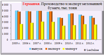 Германия. Выпуск мелованной бумаги в Германии по итогам 2012 года соответствует уровню производства в Финляндии. Пик производства приходится на 2005 г. с годовым выпуском 5 млн. тонн. За два кризисных года объемы упали на четверть. Восстановление производства в 2010 г. позволило увеличить объемы выпуска на 16%. Начиная с 2011 года производство мелованной бумаги снижается ­ – на 2% в 2011 году и на 5% – в 2012 г.