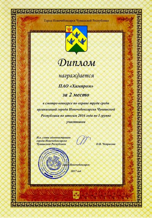 «Химпром» занял II место в ежегодном смотре-конкурсе по охране труда по итогам 2016 года среди организаций города Новочебоксарск с численностью работающих от 500 человек. Предприятие показало высокий результат организации охраны труда, но в этот раз уступило первенство МУП «Коммунальные сети города Новочебоксарск».