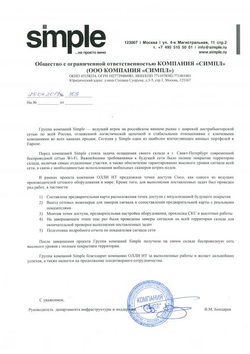 Группа компаний Simple благодарит компанию ОЛЛИ ИТ за выполненные работы и желает дальнейших успехов, а также надеется на продолжение плодотворного сотрудничества.