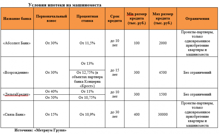 Как показали результаты исследования, проведенного аналитиками «Метриум Групп», среди основных банков, кредитующих приобретение жилья на первичном рынке, ипотеку на машиноместа предлагают только четыре игрока: «Абсолют Банк», «Возрождение» «ДельтаКредит» и «Связь-Банк».