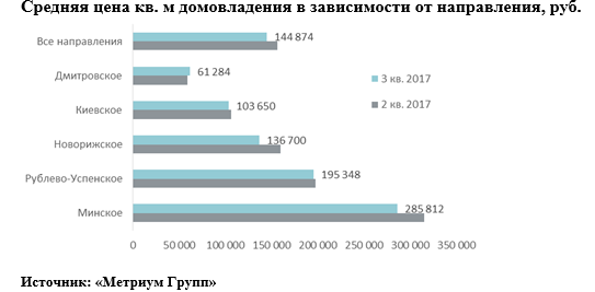 По подсчетам аналитиков «Метриум Групп», средняя цена кв. м по состоянию на конец сентября 2017 года составила 144 920 руб., что на 7,2% ниже в сравнении с предыдущим отчетным периодом. При этом отрицательная динамика была зафиксирована практически по всем направлениям. Исключение – Дмитровское шоссе, которое прибавило за квартал 3,6%.Наибольшее снижение отмечено на Новорижском шоссе (-14,5%). Основная причина – изменением структуры предложения. Кроме того, по ряду поселков, в которых в продаже остались последние лоты, было отмечено снижение их стоимости.