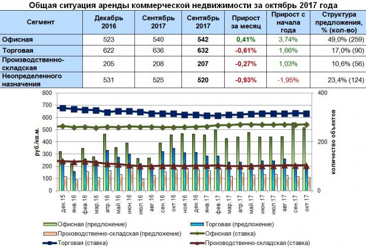 - 542 рубля – арендная ставка квадратного метра офисных помещений в октябре 2017 года. За месяц коррекция составила +0,4%.