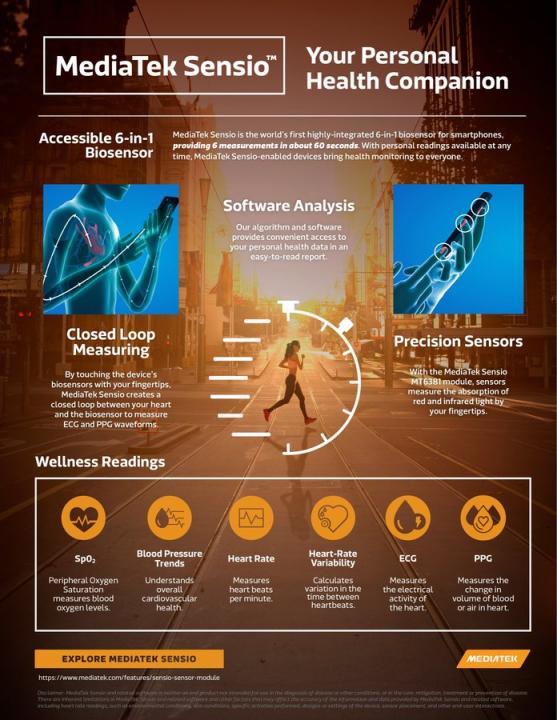 Компания MediaTek Inc. представила MediaTek Sensio™ - первый биосенсорный модуль «6-в-1» для смартфонов. – многофункциональное современное решение для мониторинга состояния здоровья, позволяющее с лёгкостью контролировать пульс, отслеживать динамику кровяного давления, изменять уровень насыщенности периферийным кислородом и т.д. Решение в форме встроенного модуля для смартфонов предоставляет потребителям возможность быстро проверять и контролировать состояние своего физического здоровья с помощью самого часто используемого устройства - смартфона.