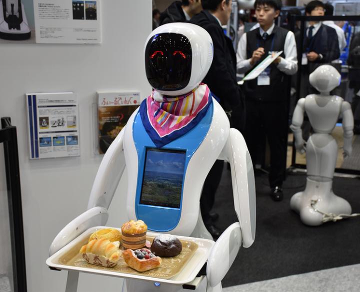 Сотрудники сферы услуг сейчас считаются одними из самых уязвимых с точки зрения их скорой замены роботами. Японские компании NEC и Social Robotics представили несколько моделей роботов, которых можно использовать для доставки товаров или в сфере кейтеринга.