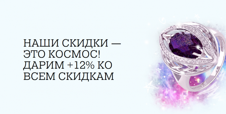 И в день космонавтики, 12 апреля, и в другие апрельские дни, ювелирные салоны сети “Русского Золота” дарят приличную скидку на любые украшения - 12%. Даже если вы не были раньше нашим клиентом, не нужно делать покупки, чтобы получить дисконт. Вы получаете его уже перед первым заказом.