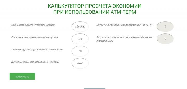 Компания «ЭкоМИРТ» представила онлайн-калькулятор расчета экономии от использования инновационных котлов «АТМ-ТЕРМ». Вычислить выгоду очень просто: достаточно зайти на сайт фирмы, заполнить пустые поля нужными значениями и получить результат. Для расчетов понадобятся такие параметры как стоимость электроэнергии, площадь и температура воздуха внутри помещения, длительность отопительного сезона. Как итог получаются два показателя: затраты в год при установке котла «АТМ-ТЕРМ» и обычного котла. Соответственно этим значениям отображается показание экономии для конкретного помещения в рублях. Воспользоваться калькулятором можно на . Также на сайте представлены все модели котлов с детальным описанием и техническими характеристиками. Для получения консультации и оформления заказа обращайтесь к менеджерам фирмы по телефону и через онлайн-чат.