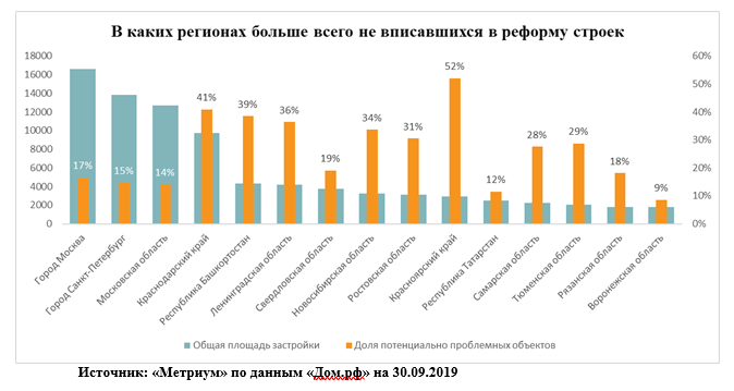 Среди лидирующих по текущей площади жилищной застройки регионов самая большая доля потенциально проблемных строек в Красноярском крае. Они составляют 52% (1,5 млн кв.м) от общего объема строительства в регионе. В Краснодарском крае в «красную зону» попадают 41% (4 млн кв.м) строящихся жилых площадей. В Республике Башкортостан таких объектов порядка 39% (1,7 млн кв.м), а в Ленинградской области 36% (1,5 млн кв.м).