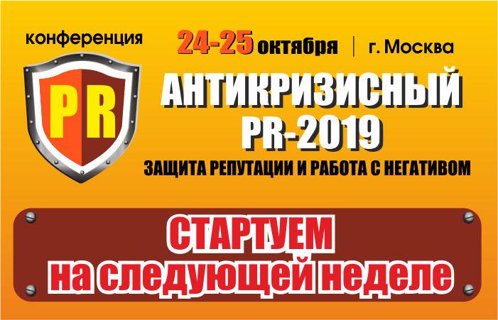 Уже через неделю – 24-25 октября в Москве пройдет ежегодная общероссийскаяспециализированнаяконференция «АНТИКРИЗИСНЫЙ PR-2019:защита репутации и работа с негативом».